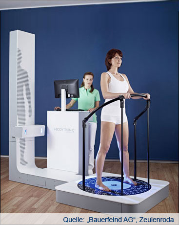 Hilfsmittel wie Bandagen oder Kompressionsstrümpfe müssen passgenau sitzen, damit sie optimal wirken können. Für das Maßnehmen stellt sich der Kunde auf die selbstdrehende Messplattform des Bodytronic 600 von Bauerfeind. Während sich diese Plattform dreht, wird aus den gewohnten Daten eben dieses exakte dreidimensionale Abbild des Körperteils erstellt, welches perfekte passende Bandagen und Strümpfe garantiert.